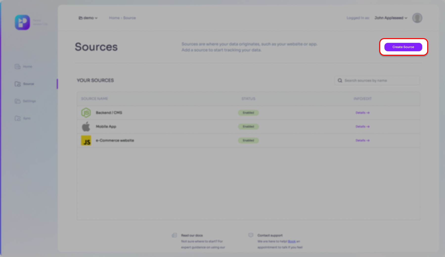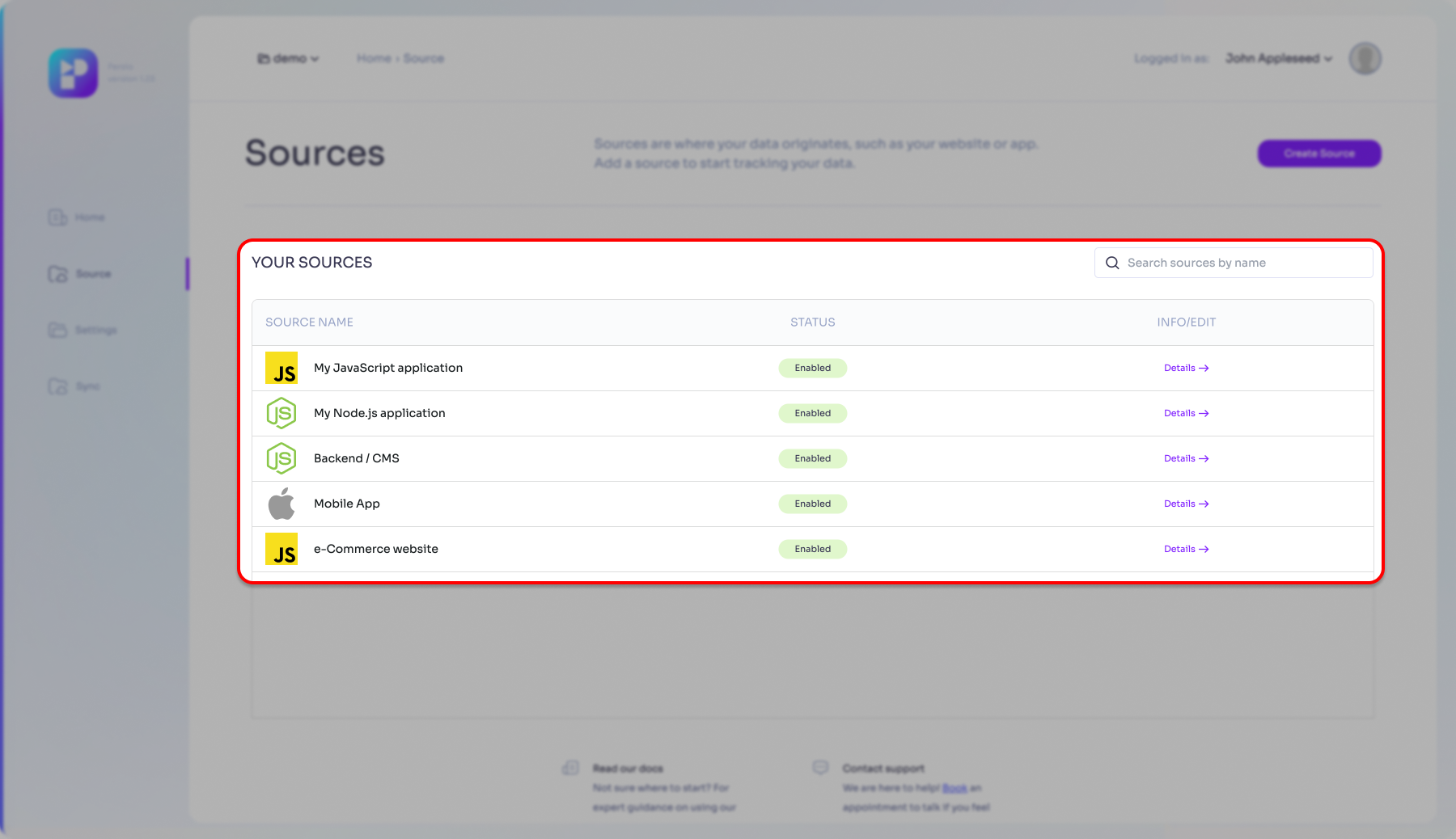 - You will be redirected back to the Sources page where your newly created Data Source will appear on the list of Data Sources, enabled and ready to use.